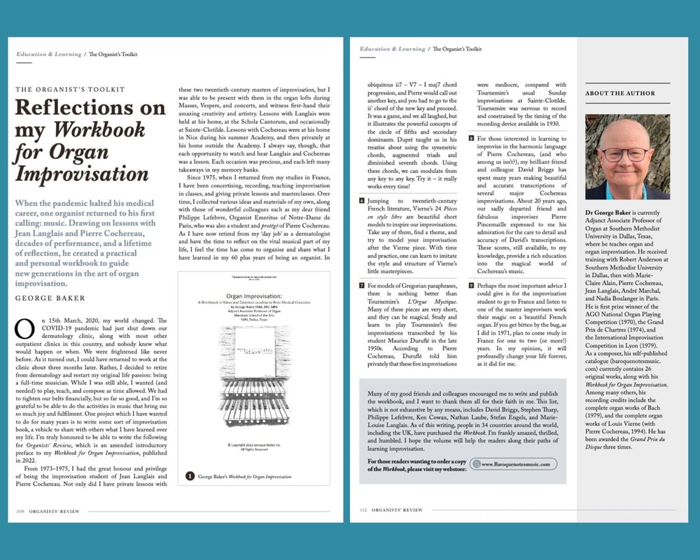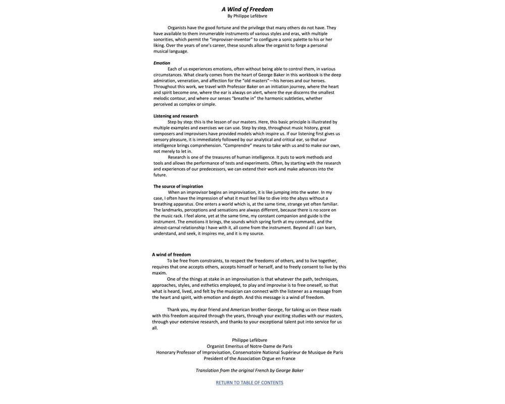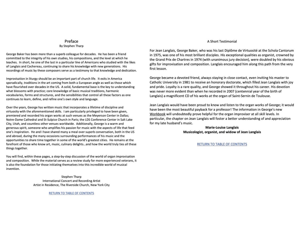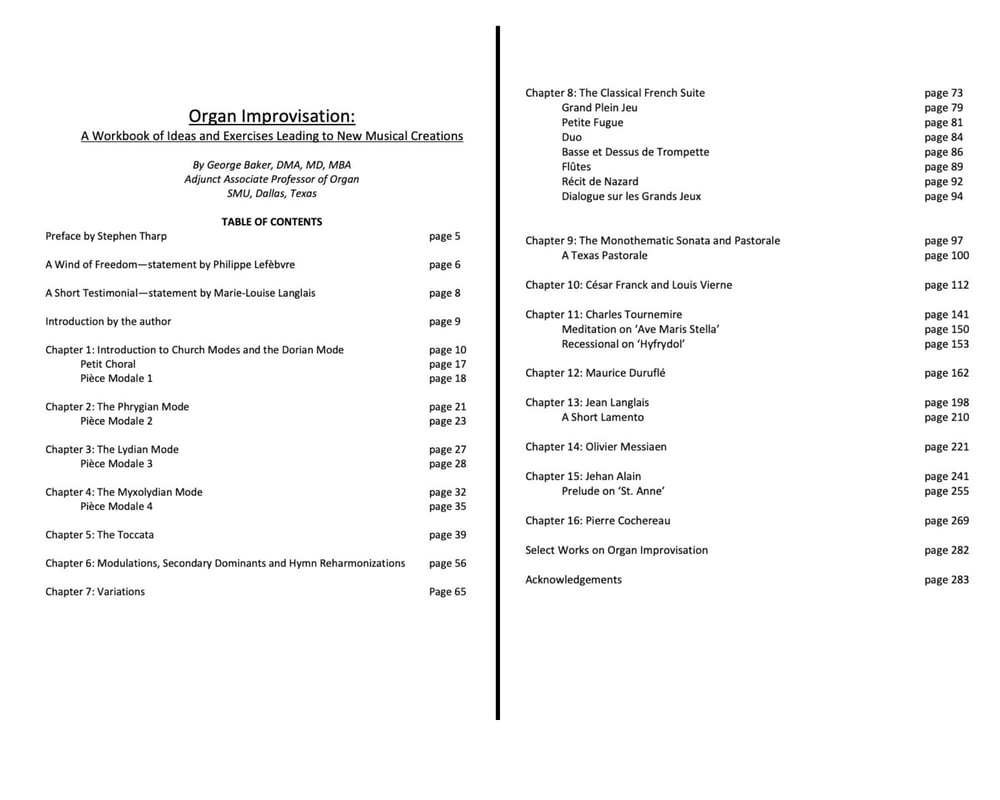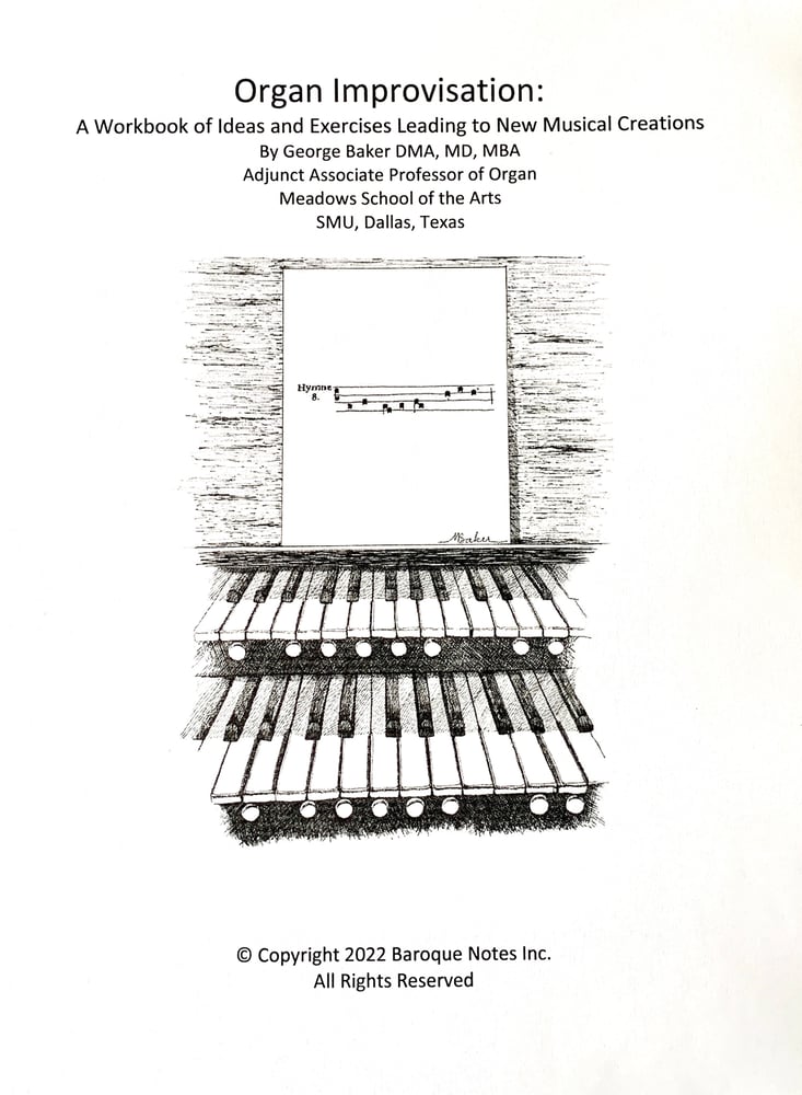 This book in pdf format contains sixteen chapters, each of which covers a topic and/or composer. A unique feature of the book is that it contains seventeen newly composed pieces, each from about a minute to several minutes’ duration. These pieces, which illustrate concepts covered in the text, could be used in a worship service and/or in concert. The Workbook is written in a relaxed, conversational style. It can be used by the beginning improviser, as well as the more seasoned veteran. George Baker DMA, former improvisation student of Jean Langlais and Pierre Cochereau, teaches organ improvisation at SMU, Dallas, Texas, where he serves as Adjunct Associate Professor of Organ. 284 pages.